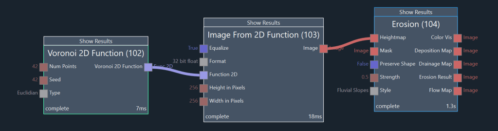 Node (102) is used to create a 2D function in the shape of Voronoi noise. This function is converted to an image using node (103). The image is used as the input of an Erosion node (104). The eroded heightmap is available as the Erosion Result output. Figure Ex 1.2 shows the result of the erosion node.