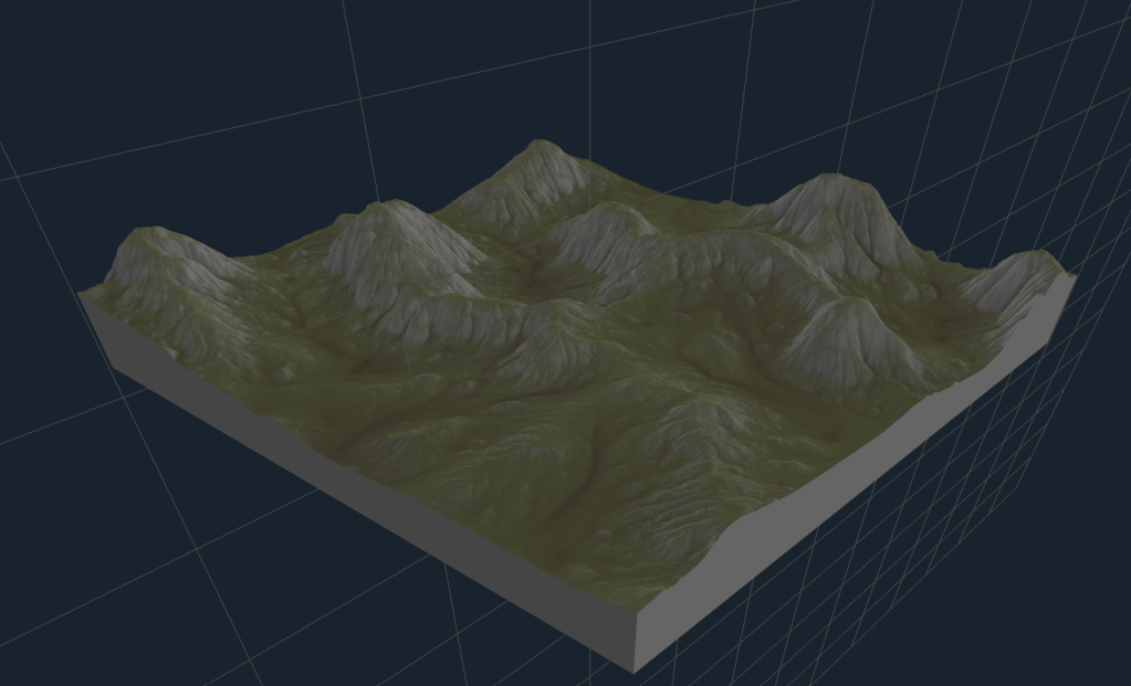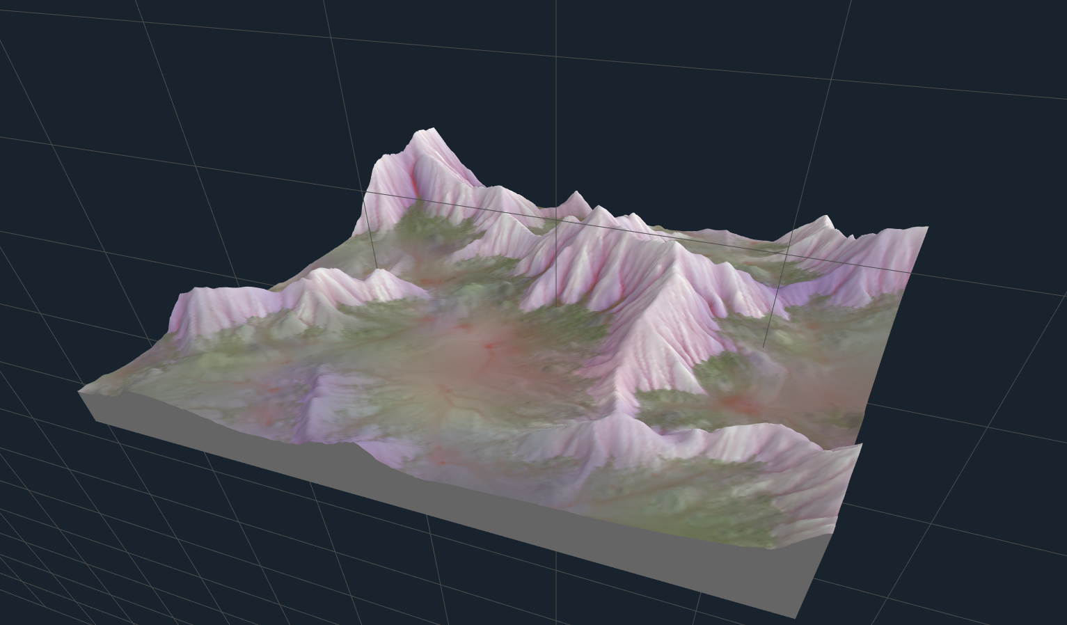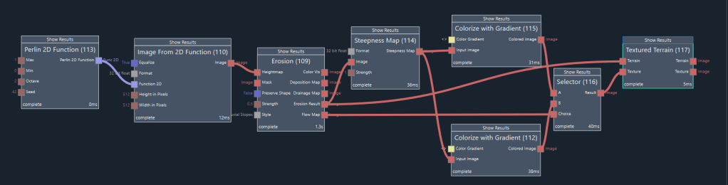 Node (116) is used to select between the two color images depending on the strength of the erosion flow, yielding the final terrain texture. Node (117) is used to visualize the terrain with the texture. Figure Ex 2.4 shows the result of node (117), the textured terrain.