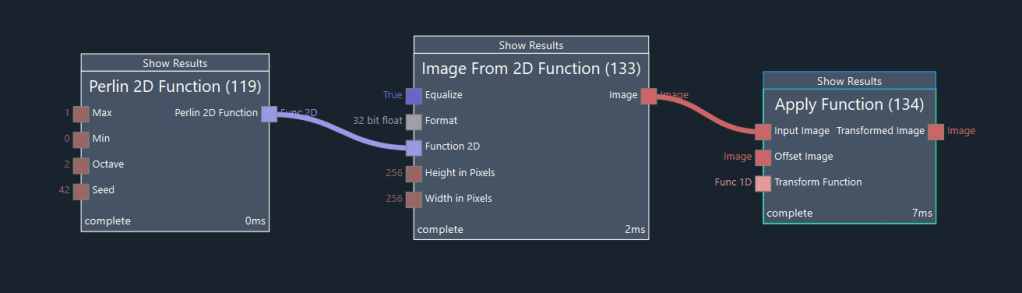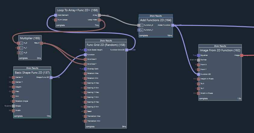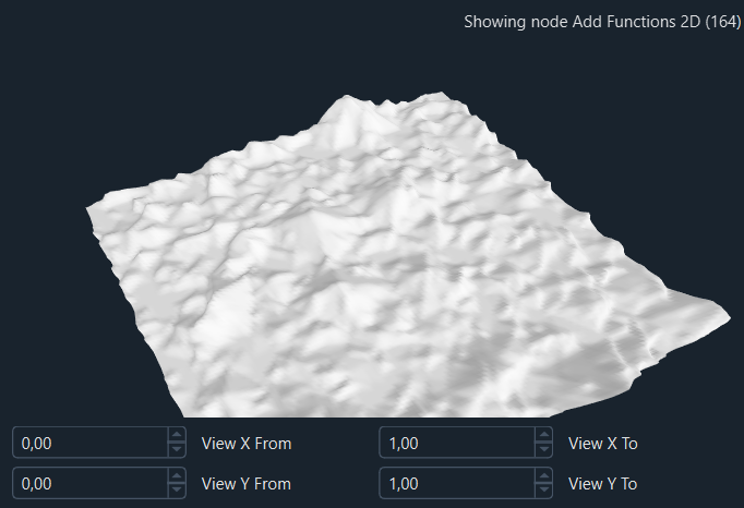 Node (137) creates a 2D function in the shape of a pyramid. This shape is repeated many times on a randomized grid using node (158). The parameter inputs of this node (158) are set so that the shape is randomly varied for each instance of the grid. Node (168) creates a loop to repeat the execution of nodes (165) and (158) four times. Each iteration will yield a 2D function in the shape of the pyramid-grid. The size of the grid is set to the Loop Index multiplied by four using node (165). The results of each iteration are combined to an array of 2D functions by node (168). All four functions in the array (the grid functions with four different grid-sizes) are summed up by node (164) to yield a 2D function in the shape of very simple rocky noise. Figure Ex 6.2 shows the result in the 2D function viewer.