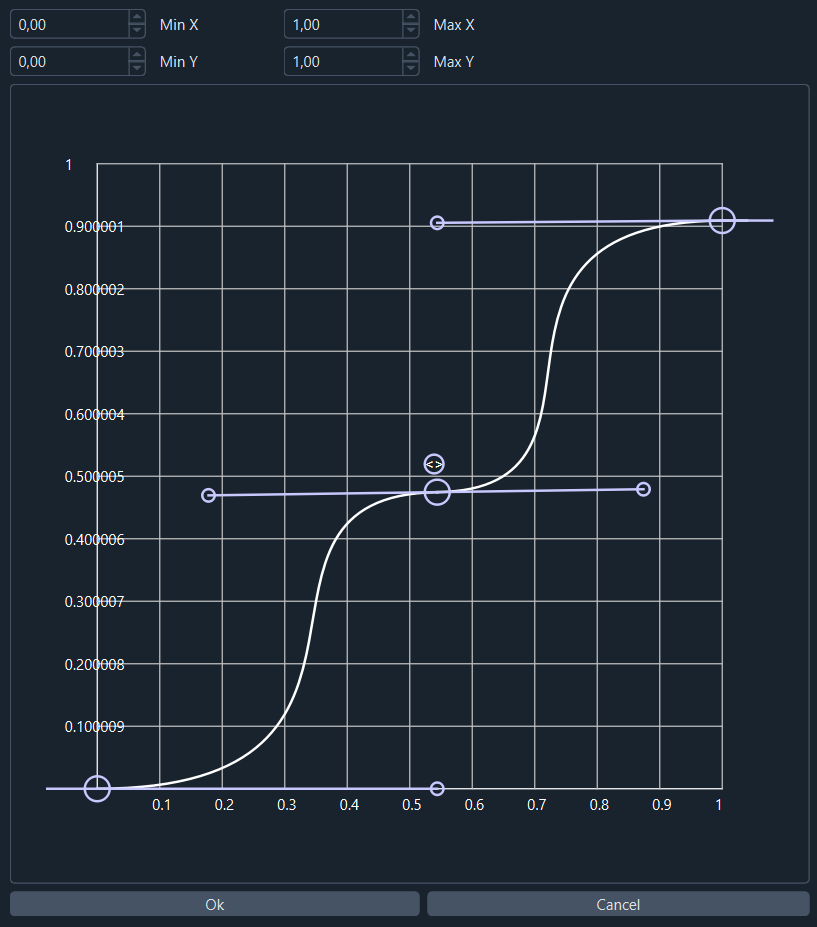 New control points can be added to the function by clicking on the line of the curve. The range in X and Y can be set in the controls above the curve editor. The result of node (134) corresponds to the Perlin noise image with manipulated brightness/ contrast curve.