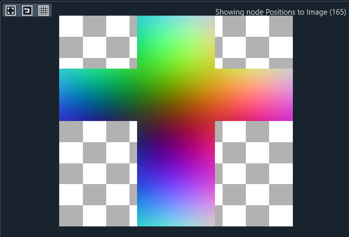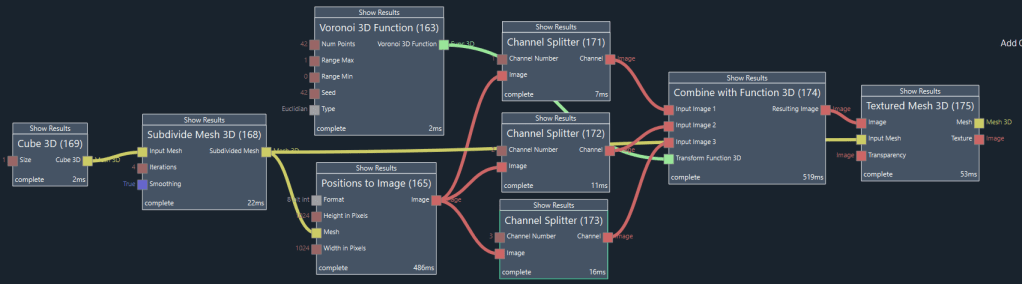 Node (169) creates a cube mesh and node (168) subdivides this mesh to create a spherical mesh shape. Node (165) maps the 3D positions of the mesh to an image according to figure Ex 7.3. Each pixel of the image represents the position on the surface of the mesh at the location of that texture coordinate. The red, green, and blue values of the pixel represent the x, y, and z value of the position on the mesh surface. These three channels are separated from the image using nodes (171), (172), and (173).