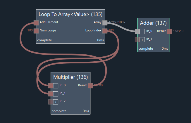 Parameter Num Loops is set to 100, so the Loop Index output will start at one and then be incremented 99 times for a final value of 100. Everytime that the Loop Index output of node (135) is reset, the following node (136) is reset and re-executed. This node (136) multiplies the Loop Index value with itself. The output Result of node (136) is “looped back” to the Add Element input of the Loop to Array node (135), so that an array is created that consists of all the result values of each loop iteration. After 100 loop iterations are calculated, the Array output of node (135) will contain all squares between 1 and 100. This array is used as the input for an Adder node (137) which yields the expected final result of 338350.