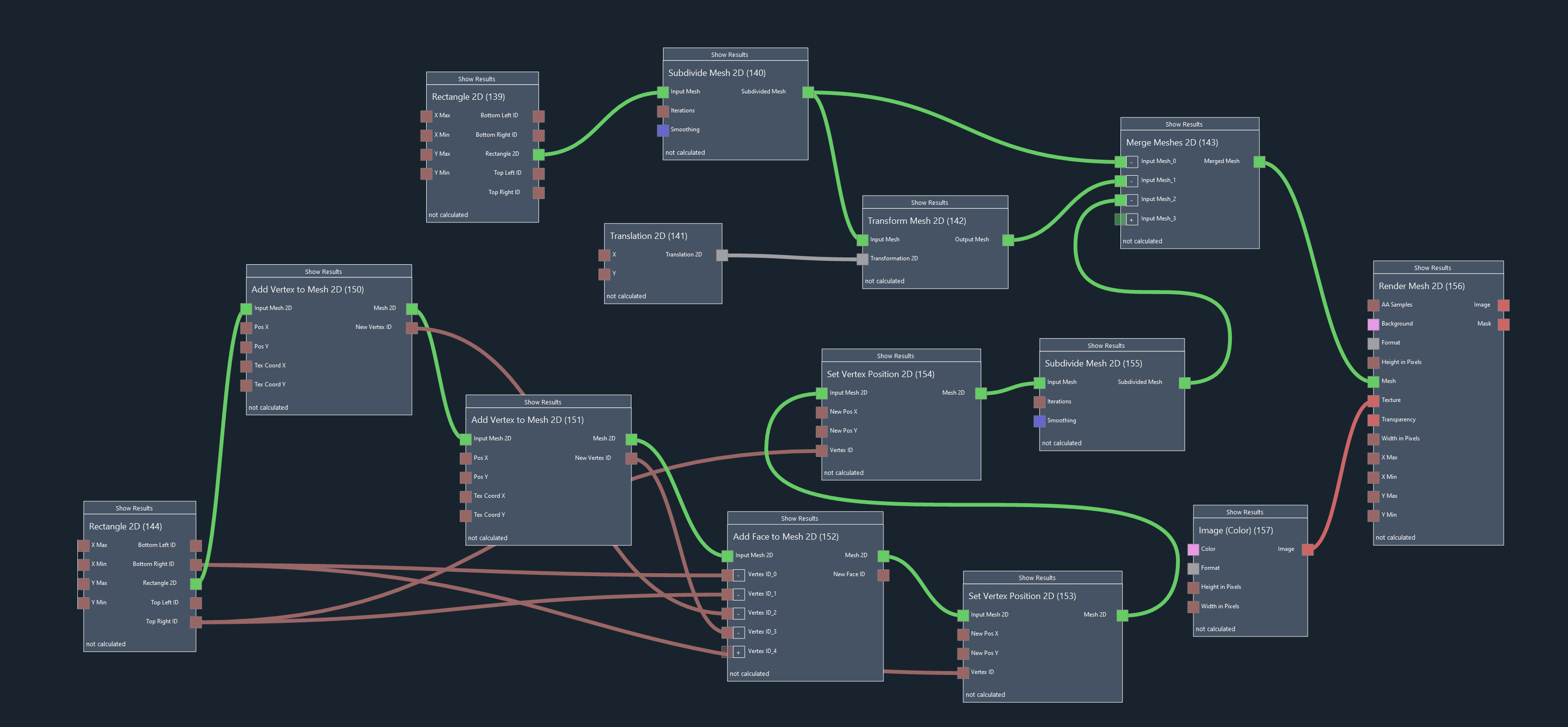 A rectangle mesh is also used as the starting point for the smiley’s eyes. Node (139) creates the rectangle and node (140) subdivides it and smoothes it into a round shape. The output of node (140) is the left eye of the smiley face. Node (141) creates a translation and node (142) applies the translation to the eye mesh, translating it in X to the right to create the right eye.