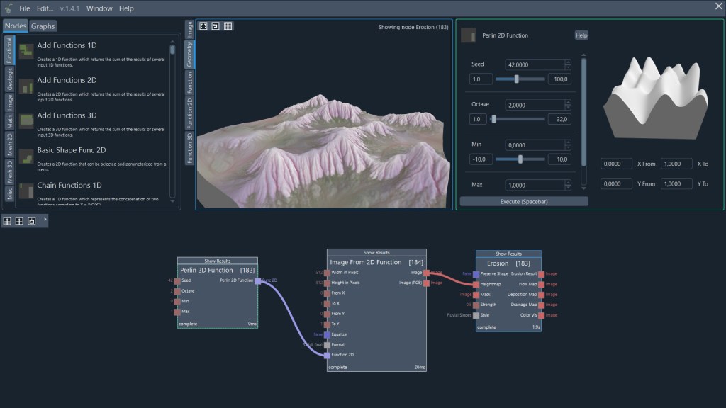 As a last node, add Erosion from the tab Geologic. Connect the output Image from the node Image from 2D function to the input Heightmap of the Erosion node. The node graph is now complete.