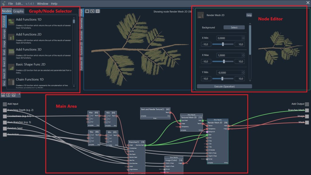 Nodes are the basic building blocks for node graphs. These nodes can be dragged to the main area. Connect these nodes to create node-graphs that generate and manipulate images, meshes, or other assets.